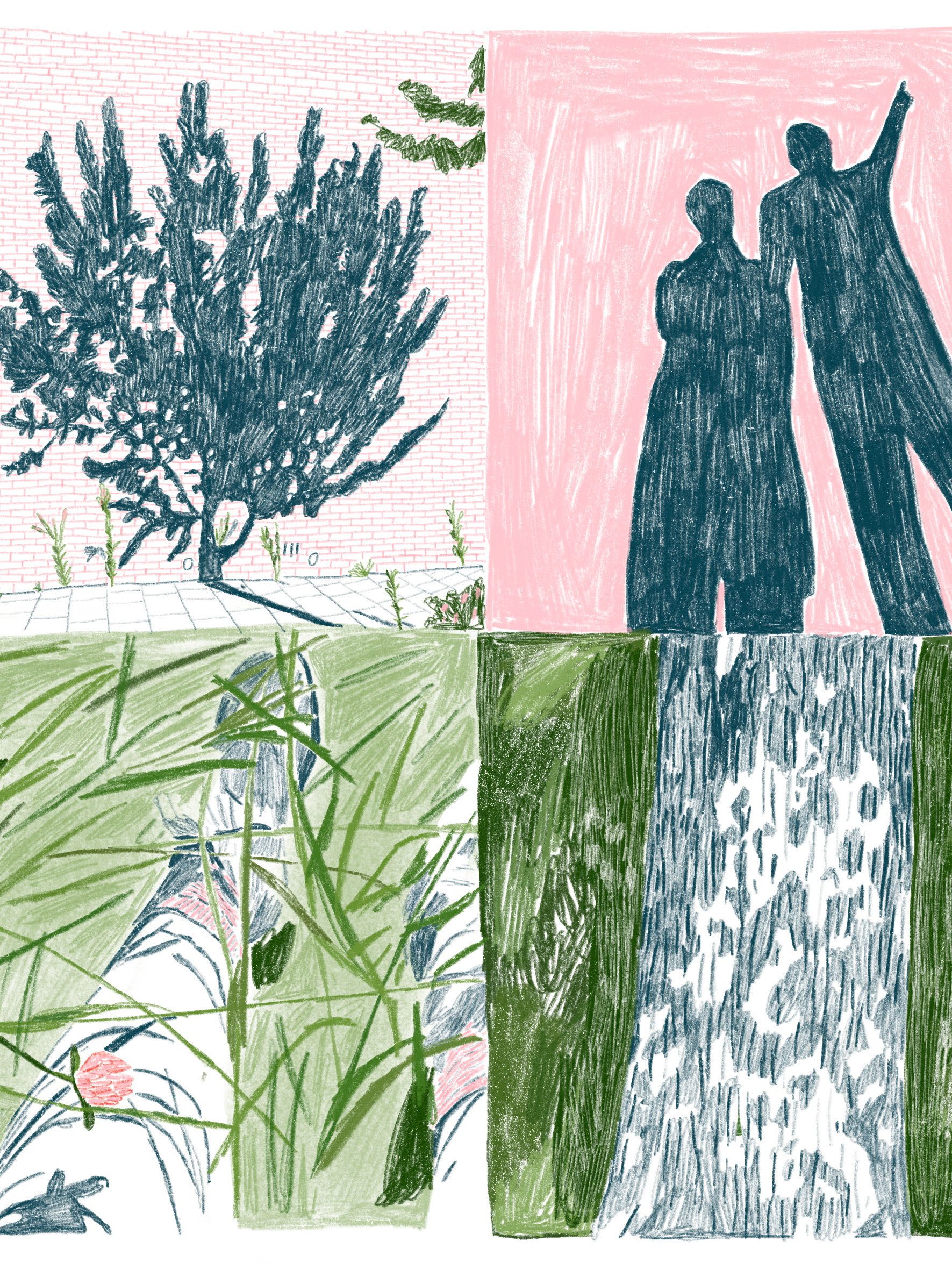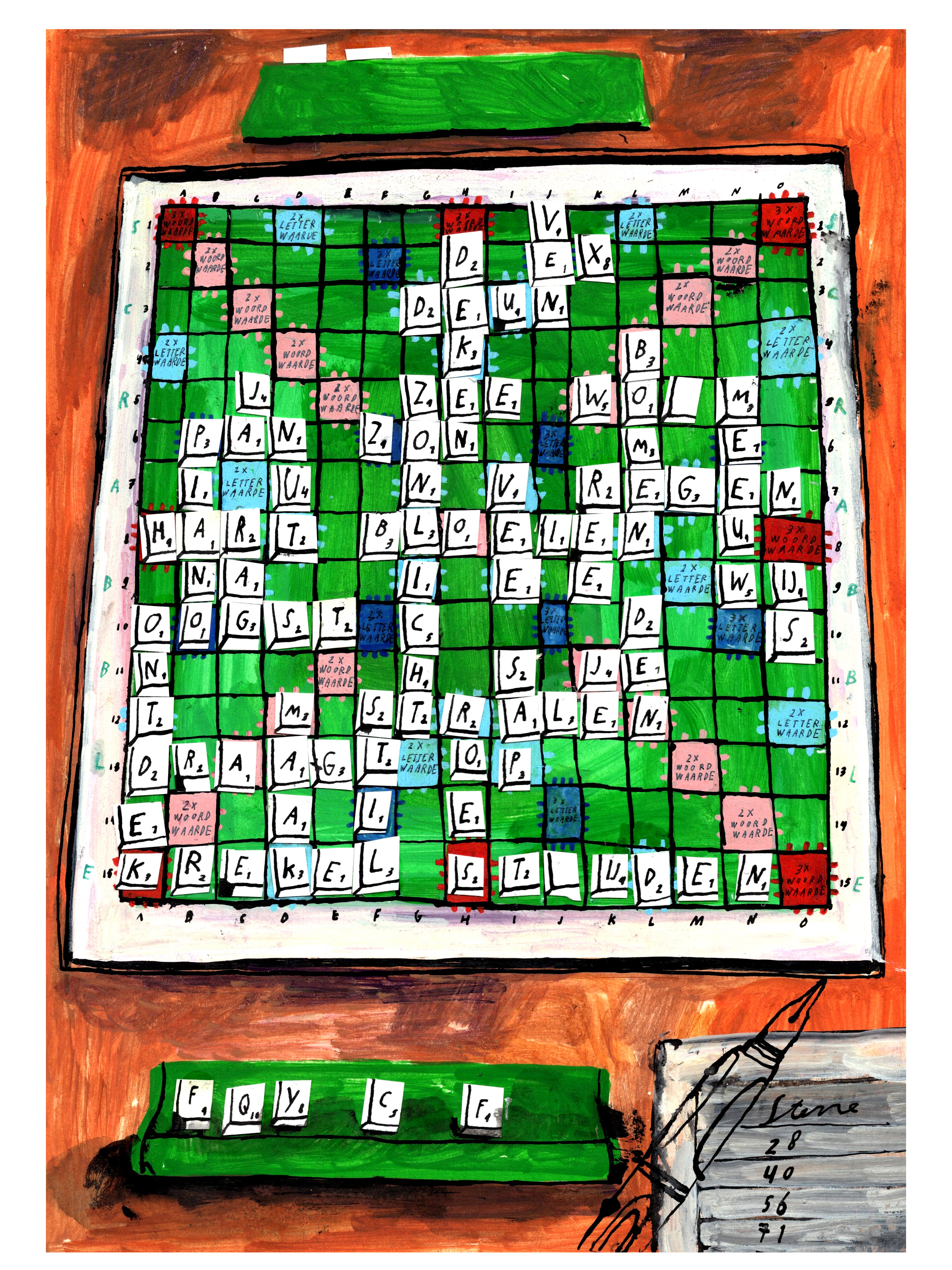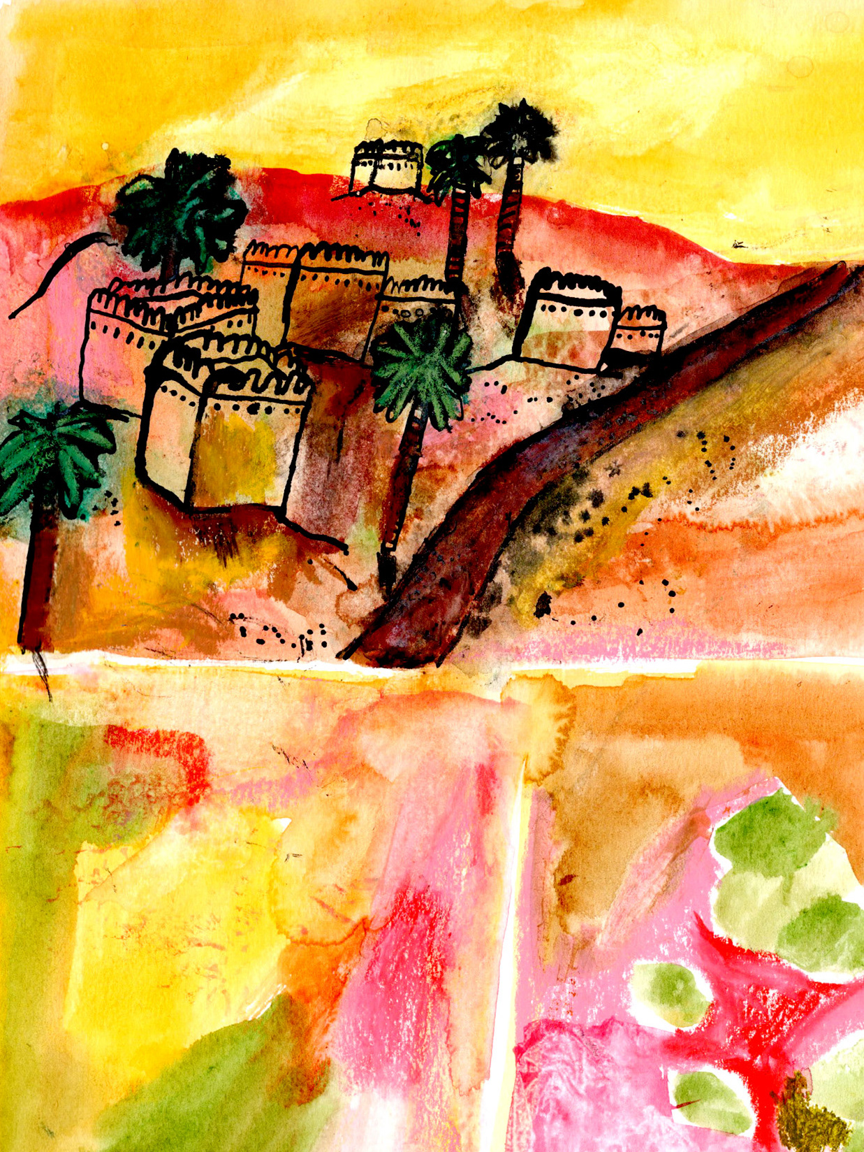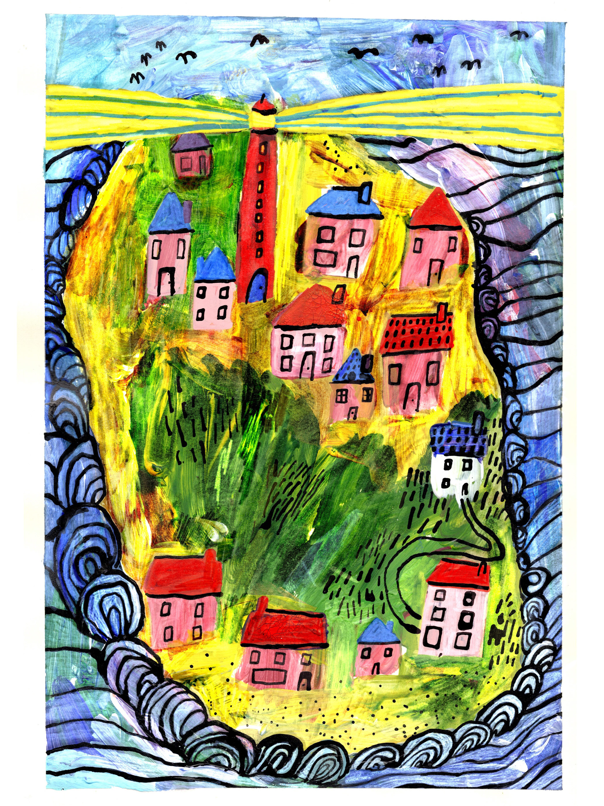 DUINDORP AAN ZEE, WAAR HUIZEN SCHUILEN TUSSEN ZAND EN WIND. ACRYLVERF EN OOSTINDISCHE INKT • FEBRUARI 2026