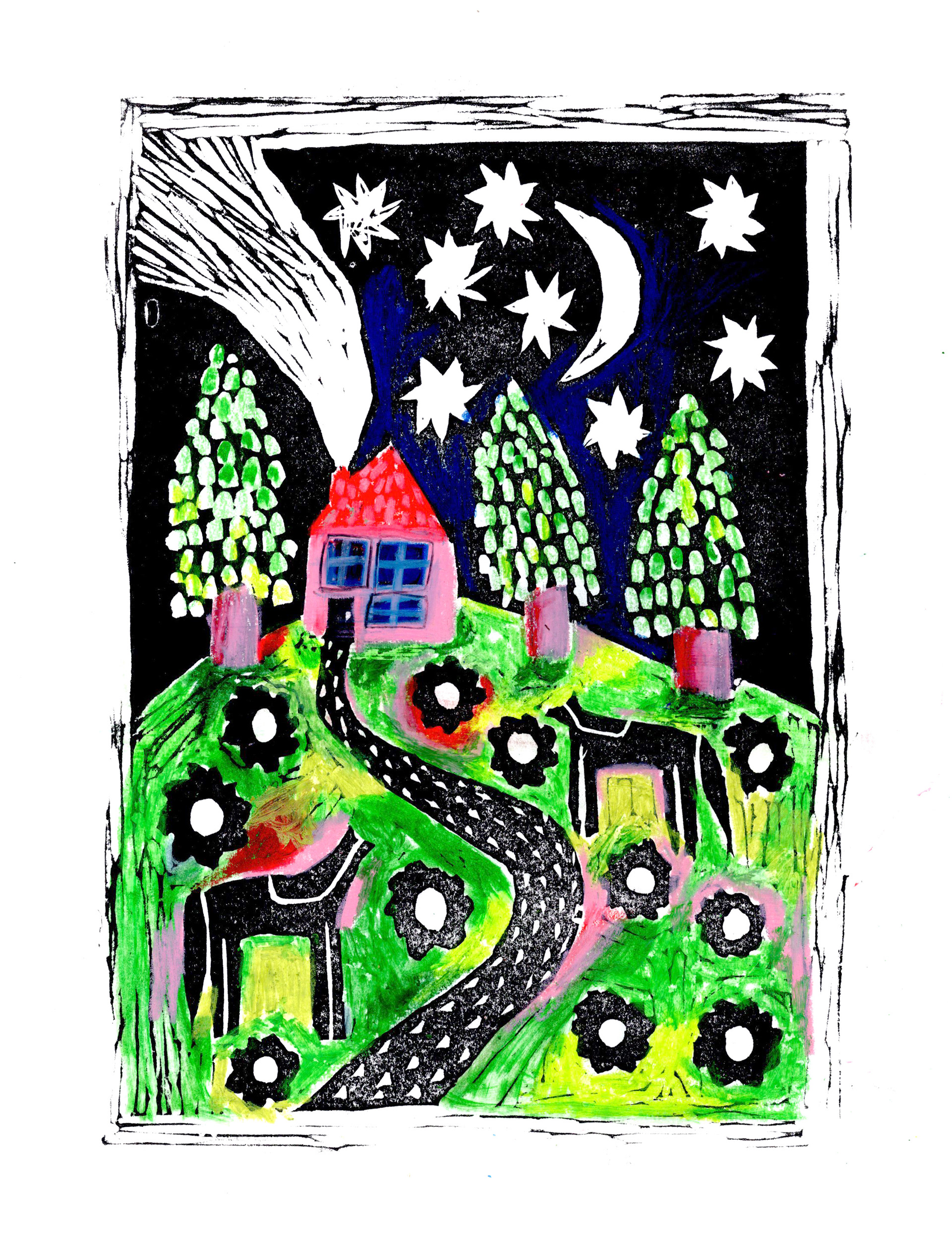LINODRUK VAN EEN BERG MET PAARDEN EN EEN HUIS, LATER INGEKLEURD MET POTLOOD EN VETKRIJT • APRIL 2024