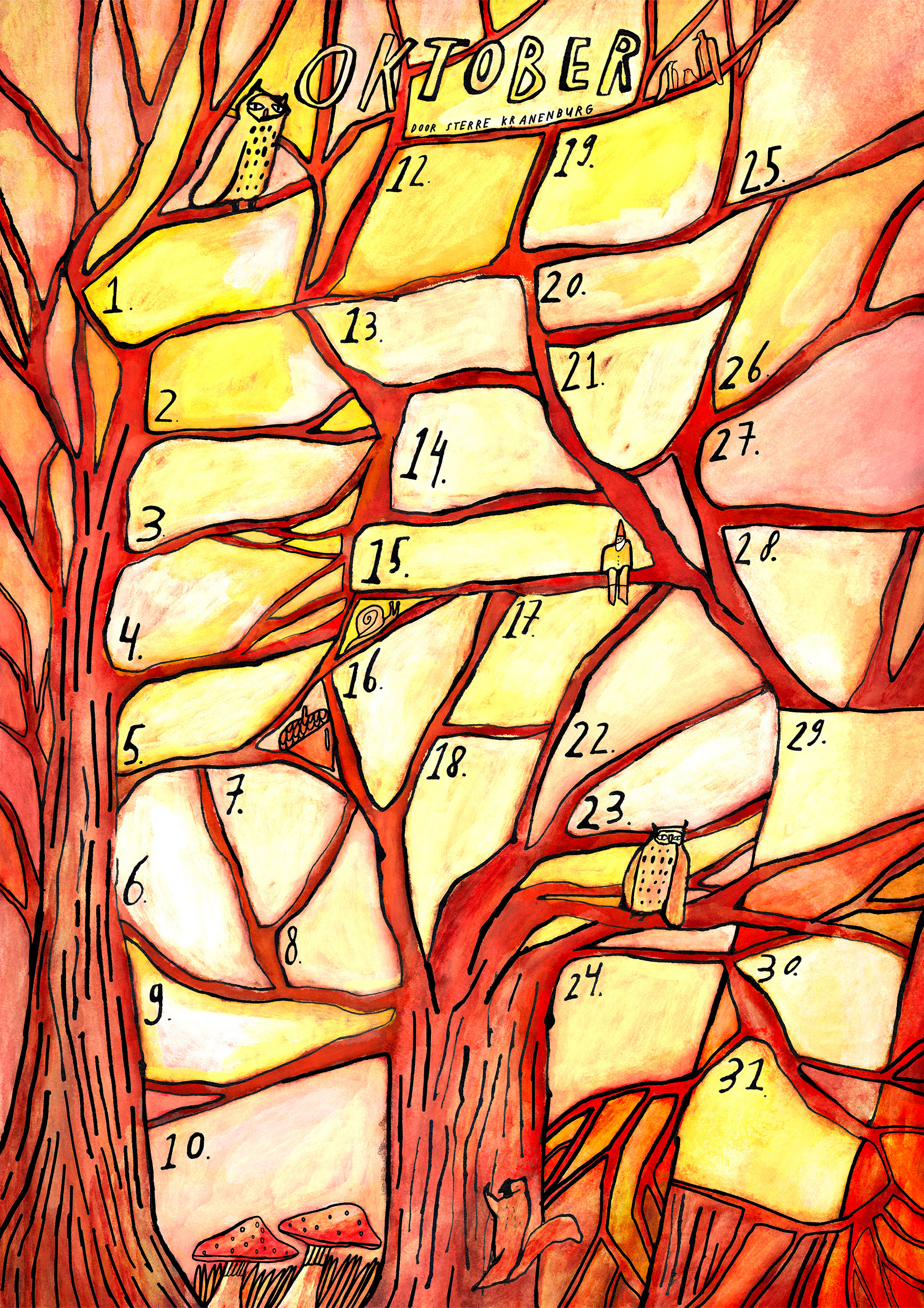 DEEL VAN EEN VERJAARDAGSKALENDER DIE WE MET ONS COLLECTIEF DE HOOGWERKERS MAAKTEN, MAAND OKTOBER, EEN HERFSTBOS OM TE VOELEN, LINKS EEN BEELD, RECHTS DE DAGEN · DECEMBER 2025