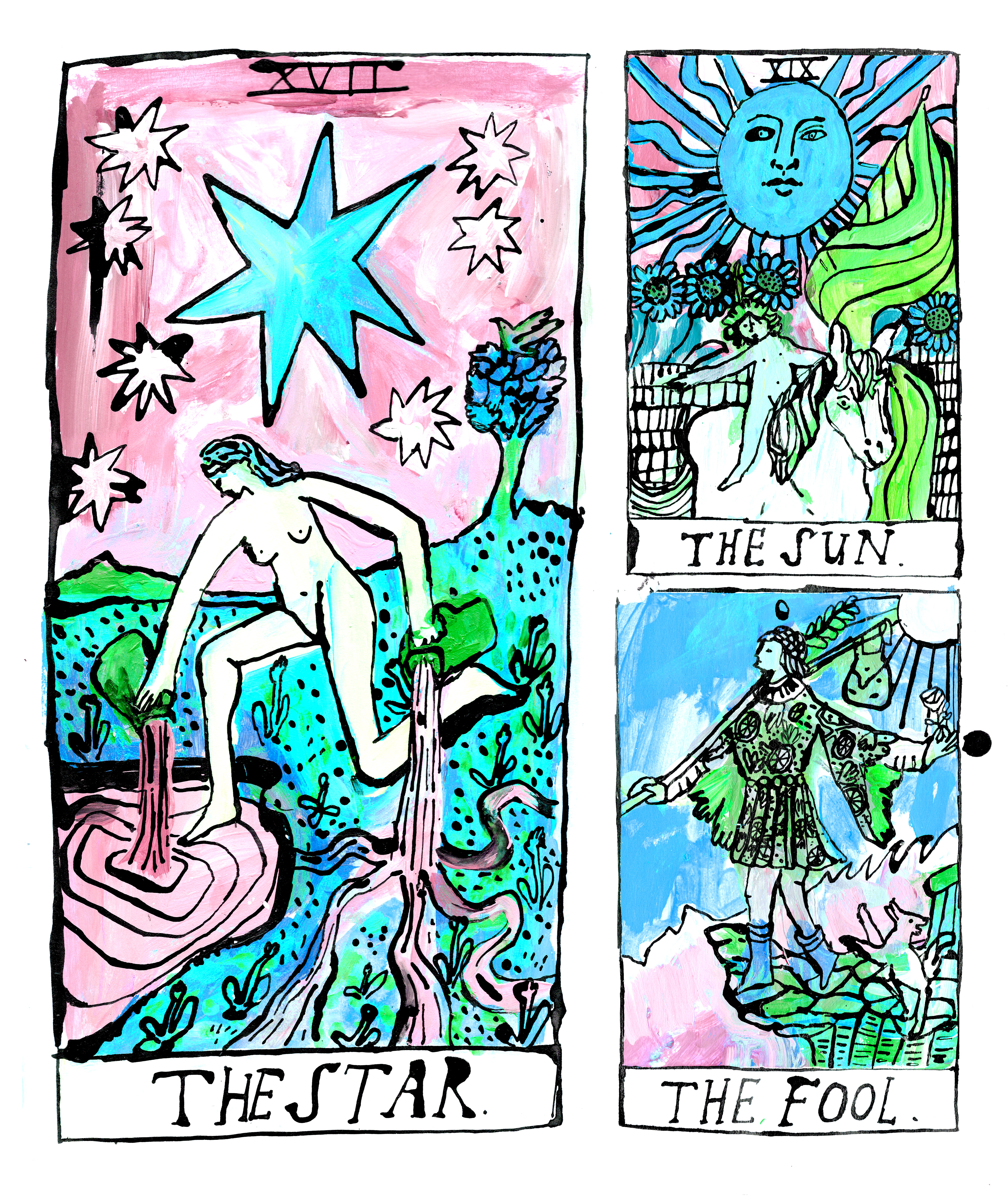 ILLUSTRATIES VAN TAROTKAARTEN (‘DE ZON’, ‘DE DWAAS’ EN ‘DE STER’) IN ACRYLVERF EN INDISCHE INKT · NOVEMBER 2025